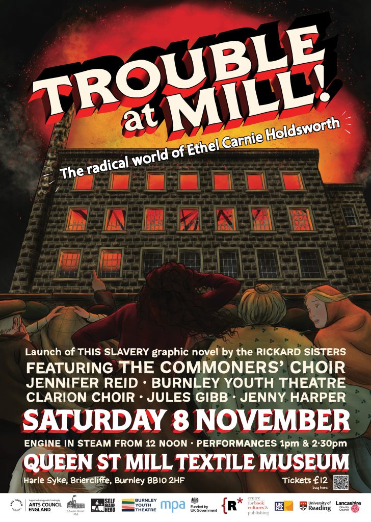 An immersive spoken-word and song spectacular at Queen Street Mill Burnley, celebrating Ethel Carnie Holdsworth and the Rickard Sisters’ new graphic novel adaptation of her radical story This Slavery.